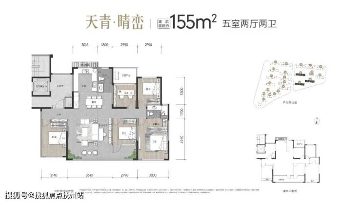 约155㎡五室两厅两卫:私享入户电梯前厅;约15.4米南向面宽,巨幅落地窗;LDKB一体,约8.5米开敞式双联阳台;北向宽境设备平台空间;约3.8米主卧套房。
