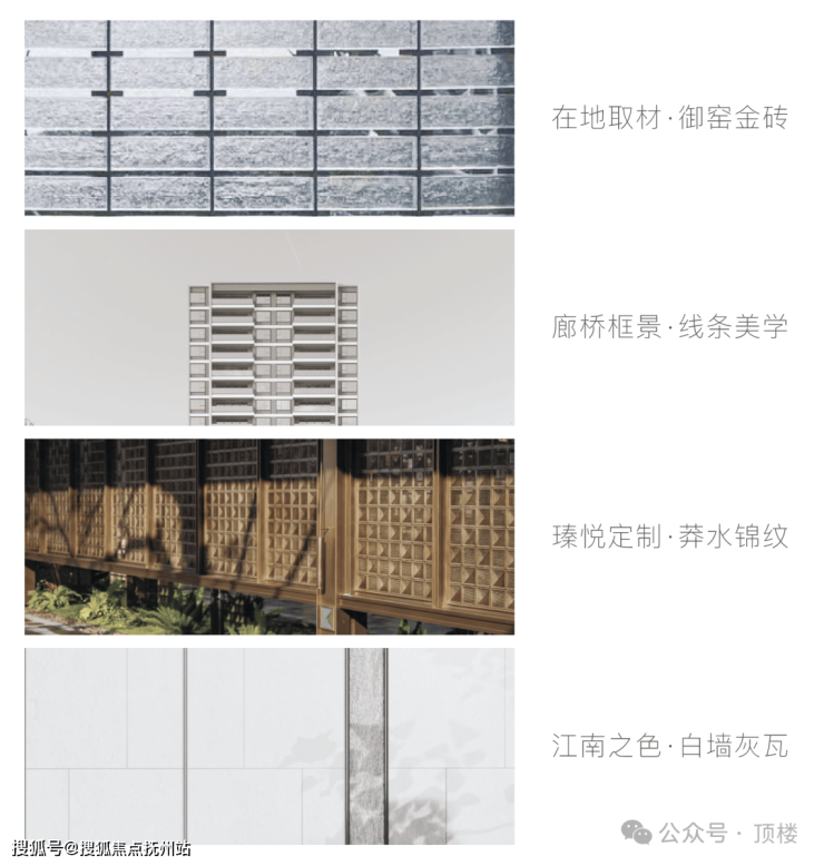 保利姑苏瑧悦取法苏州园林的廊桥框景线条美学,演绎为框体线条造型和简洁舒展的立面肌理。在地取材,运用质朴拙雅的御窑金砖,提取粉墙黛瓦的江南之色,定制兼具东方韵味和现代质感的蟒水纹,呈现与众不同的东方韵律和建筑表情,让家成为城市中一眼的确定。