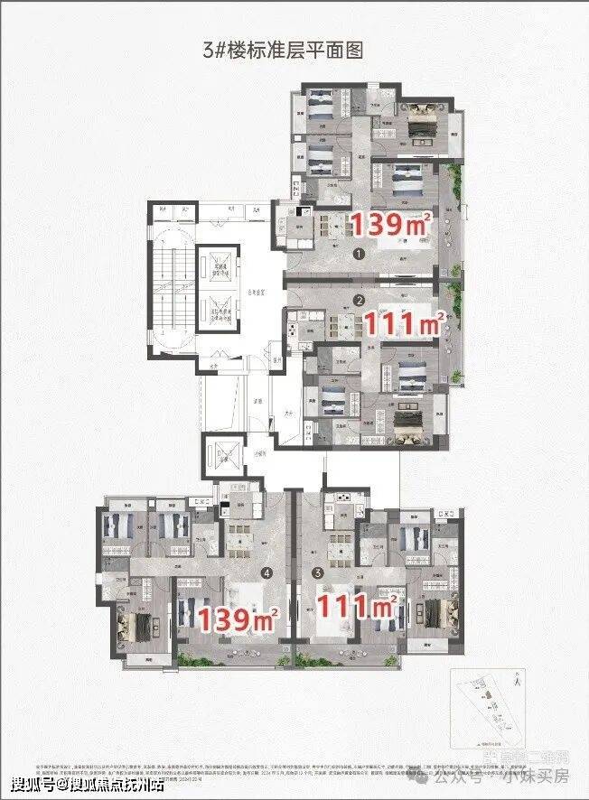 从3#的平面图来看,1号房和2号房相当于2梯2户,优先选择这两个;3号房和4号房相当于1梯2户,中间连廊连接;2个139㎡的户型,部分卧室可西北方向看江,不过也要15层以上才行。