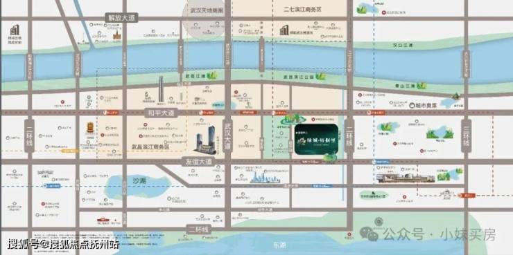 项目位于武昌二环线与和平大道交汇处南侧,属于武昌滨江范围,二七长江大桥桥头堡,行政属于武昌区,近邻二环线快速路与和平大道、友谊大道双主干道。