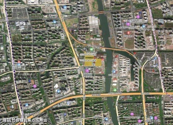项目北面河景,再往远处是上塘高架,直线约150米左右;东面商地,小区主要出入口就在这个方向;西、南两面有次要出入口;