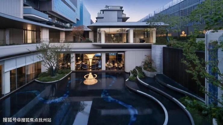 庭——“虽由人作,宛自天开”。以非遗昆曲中的造型水袖串联建筑景观室内联动,形成室内外一体化水韵山水自然庭院。以狮子林布局为骨架,水袖文化为底蕴。中庭水景池底以水袖曲线为索引,以树脂琉璃打造水袖的质感与灵动。