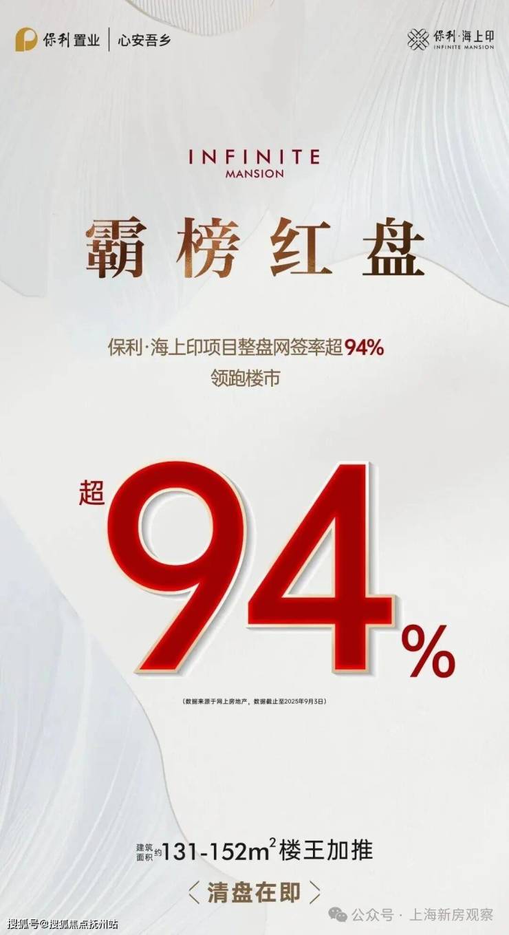 最新消息!闵行三开三罄的顶流红盘「保利·海上印」四批次9月13日已过会均价84143元/㎡!!52套建面约131-152㎡收官楼王,错过再无!想上车的朋友抓紧关注,别错过下一轮红利窗口!全部一梯两户无连廊,所有户型层高均为3.1米;约1500㎡下沉会所+约1400㎡架空层等社区高阶配置;售楼处线上火热预约中!
