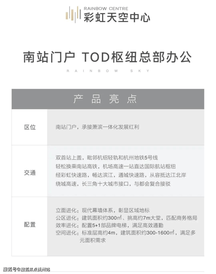 依托江南板块整合规划,落位于萧山核心区的彩虹天空中心紧邻杭州南站枢纽——这一钱江南岸要素流入与辐射的重要门户,有效承接长三角先进制造集群的外溢资源,区域发展势能显著。项目聚焦“产城人文”融合,配套打造先进制造服务、科创企业孵化等产业载体,联动周边产学研资源,为企业提供高效协同空间。