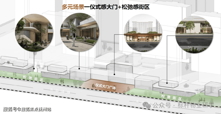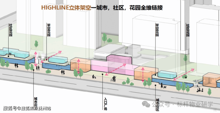 通过解读“架空车库不计容”的政策条件,我们将沿街空间整体抬高,策略性地植入配套功能与车库系统。这一设计处理使抬升的基座成为城市与社区之间一道柔和的过渡界面,有效隔绝了车行干扰与视觉穿行,保障了社区内部的私密性与安宁,又使商业配套与街道活动紧密衔接,延续了城市街区的烟火气与活力。