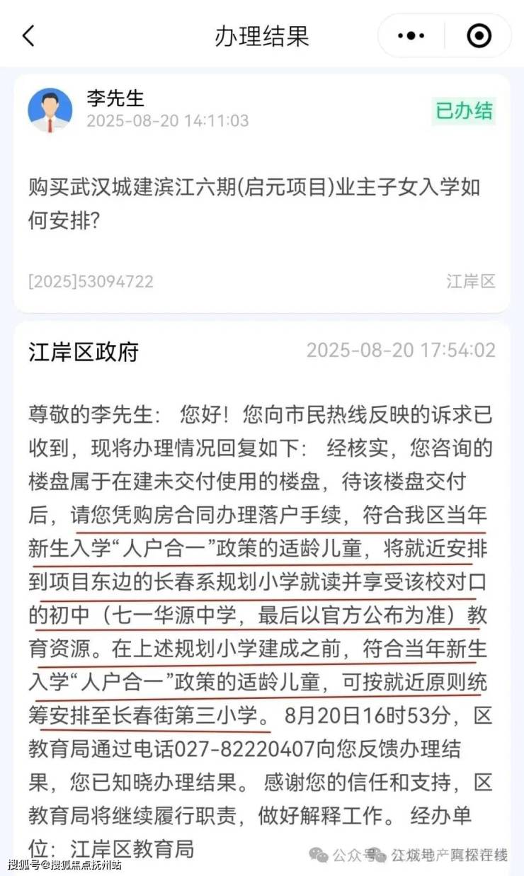 城市留言板已明确指出,武汉城建·启元未来就近安排长春系小学,在规划小学建成之前,符合“人户合一”政策即可就近原则统筹安排至长春街三小!中学对口七一华源中学!