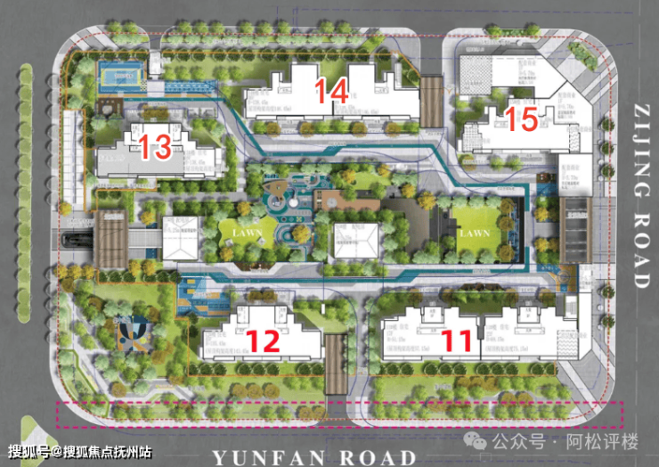 从平面图看,即将加推的13号楼位于社区西北部,南向可俯瞰社区中央园林,因为与前面楼栋错开布局,遮挡少,部分房源还有一定看湖视野。