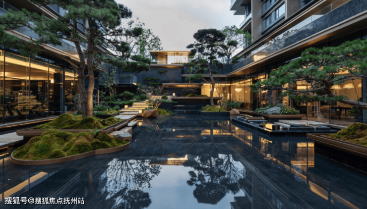 下沉式庭院,融入立体景观理念打造,园中的双杆黑松、赤松、油松都是总经理亲自挑选而来地上园林实景,做了坡地设计,植物种类丰富。设计师说,园中栽种了一棵50年树龄的桂花树,为了找到这棵树冠、树型符合要求的树,团队跑遍安徽、无锡、杭州、南京,历时2个多月才寻到,非常用心