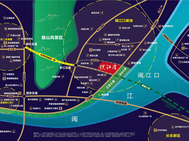 悦江湾项目地处福州闽江口核心区,是福州市“沿江向海,东扩南进”发展战略的中轴;同时项目依托“ 福州新区”、“自由贸易试验区”、“海上丝绸之路核心区“、“两岸经济合作示范区”四大国策加持,区域热度不断提升。闽江口是继滨海新城之后又一重点发展区域。