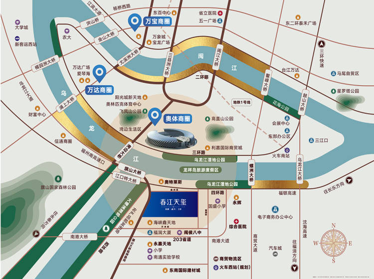奥体商圈、奥体莱斯购物广场,乌龙江湿地公园,大樟溪湿地公园,综合医院,闽侯八中,国盛小学
