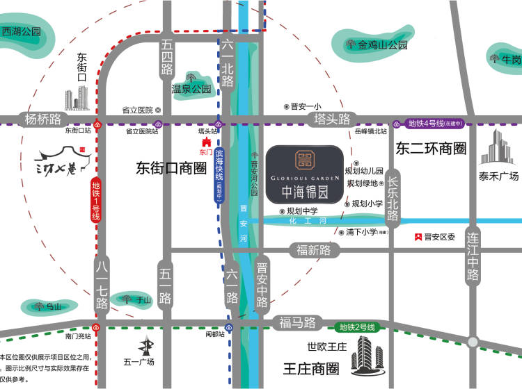 地铁:毗邻在建地铁4号线与规划滨海快线的换乘站塔头站仅约200米。4号线预计2022年3月开通,滨海快线拟于2020年动工,具体规划以政府公示为准。