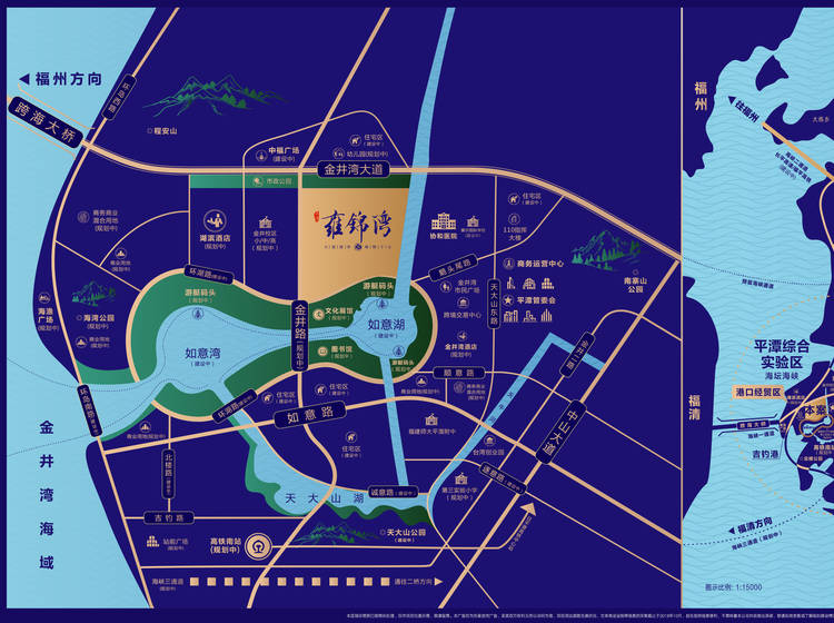 平潭雍锦湾,位于平潭综合实验区入岛首站位置,与国企鼎新房地产(平潭排名前列房地产开发国企,土开集团旗下鼎新房地产)强强联合合作开发,占据城市主流地段,西临安海路,南靠环湖东路,北面即是金井大道;平潭门户,新中式品质代表,高使用率通透复式、正南向瞰湖观海高层,用品质书写匠心雍锦。