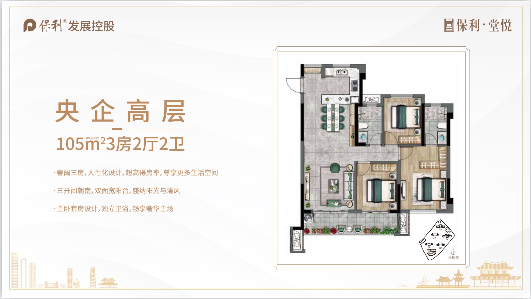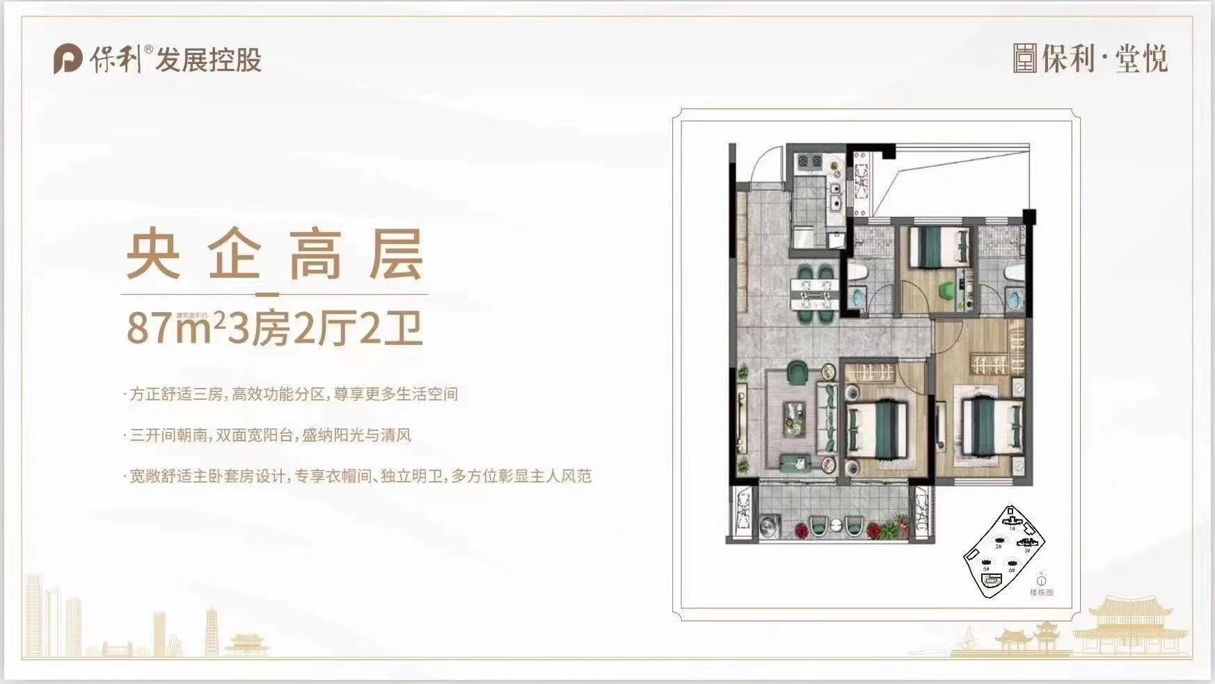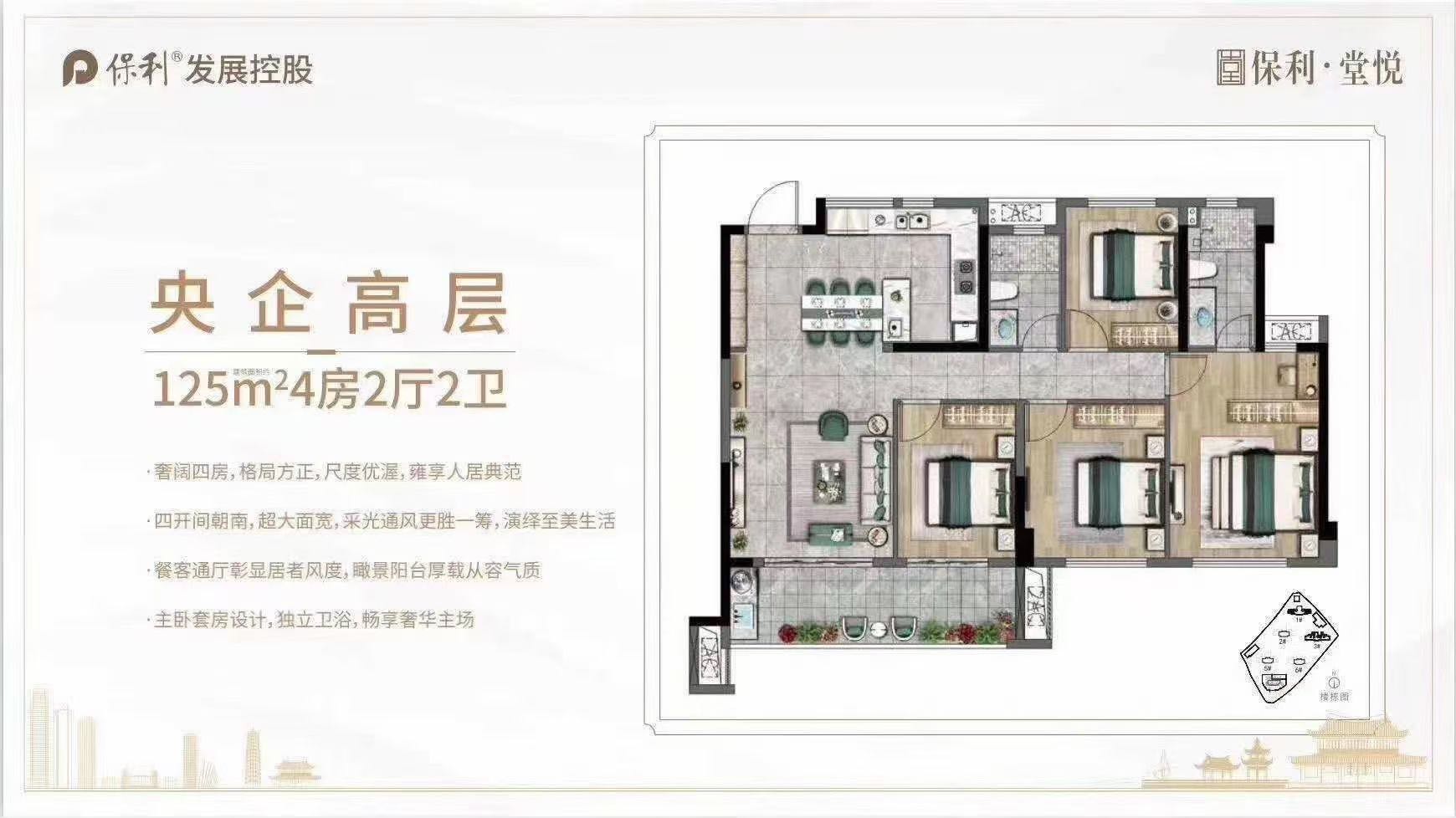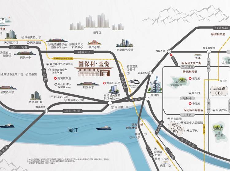 保利·堂悦是保利在福州的排名前列堂悦系作品,位于闽江沿岸核心区,鼓楼与甘蔗的桥头堡位置,与鼓楼无缝接壤,不过江不过桥,汇聚地铁5号线、绕城高速、马鞍山隧道等多维交通资源,便捷通达,近享鼓楼纯熟生活配套。项目规划5栋78-125㎡住宅高层产品,以高端人文系经典作品“堂悦”系,打造福州西新城人居标杆。