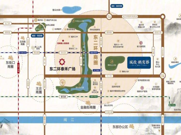 城投鹤鸾郡位于福州市晋安区东二环板块,步行在10分钟左右可到达泰禾广场、泰禾剧院、牛岗山公园、鹤林公园等周边配套,自驾10分钟车程可到火车站、汽车北站等地,社区周边还规划北侧省妇幼医院,西侧规划小学及东湖公园。