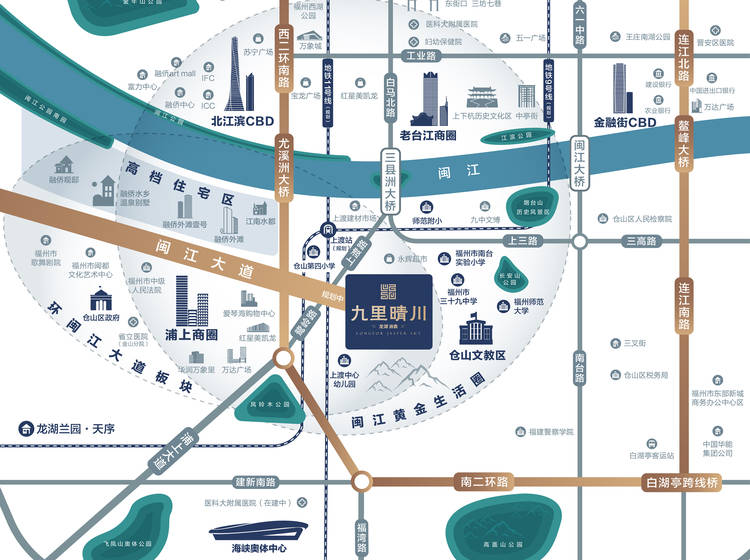 项目位于寸土寸金的二环内,福州主城仓山二环内闽江大道最东侧,与鹭岭路的交汇处,紧邻浦上大道商圈万达广场及爱琴海购物中心,九里晴川打造的是该区域唯有的高端低密纯商品洋房社区。周边商圈环绕,学府林立,交通便捷,生活氛围浓厚。 项目占地面积约5.6万方,规划14栋城芯低密洋房。