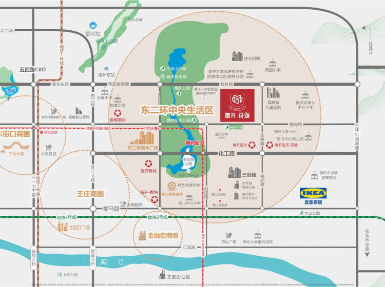 项目周边的生活配套完善且距离近,坐拥约150万方泰禾广场、11万方宜家家居综合体,近享鼓楼东街口商圈、五四CBD、海峡金融街、摩天轮综合体(在建中),大润发、沃尔玛等商业环伺,繁华万象触手可及。举步可达近2000亩晋安湖生态公园,周边有4大公园环绕,醉氧美景。百亿“硅谷”三创园,市群艺馆/市少儿图书馆/科技馆三大文化地标……项目周边的教育资源配套也是首屈一指的,享有晋安区教师进修学校附属幼儿园、晋安附属二小、福州第三中学(晋安校区)等一站式精英教育链及福建省儿童医院(三甲医院),省第二人民医院东二环院区,省立医院等完善医疗条件。