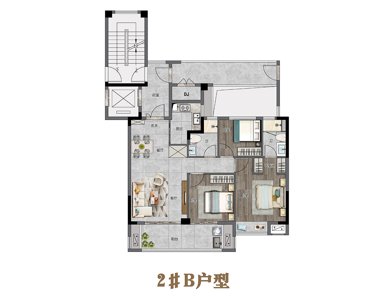 3室2厅2卫-2#B户型建面约98m²三房两厅两卫一阳