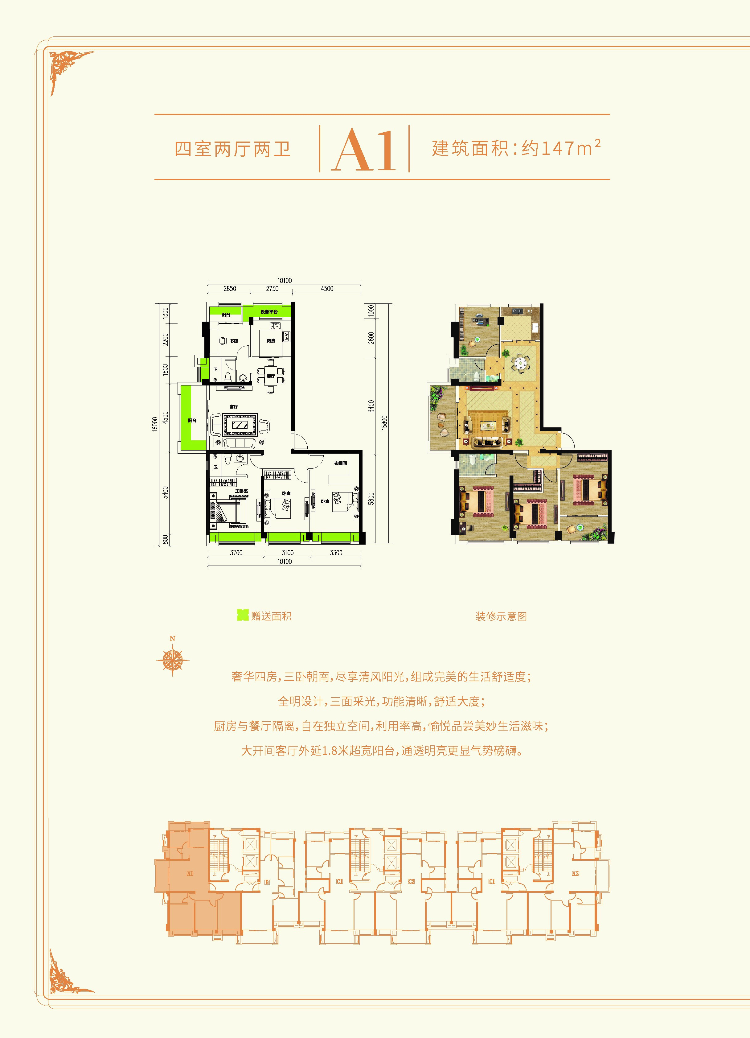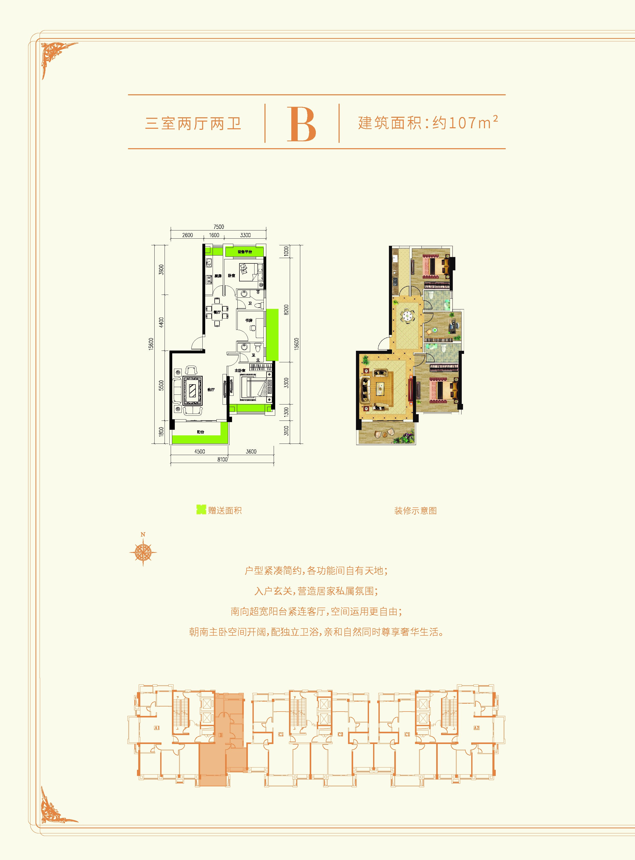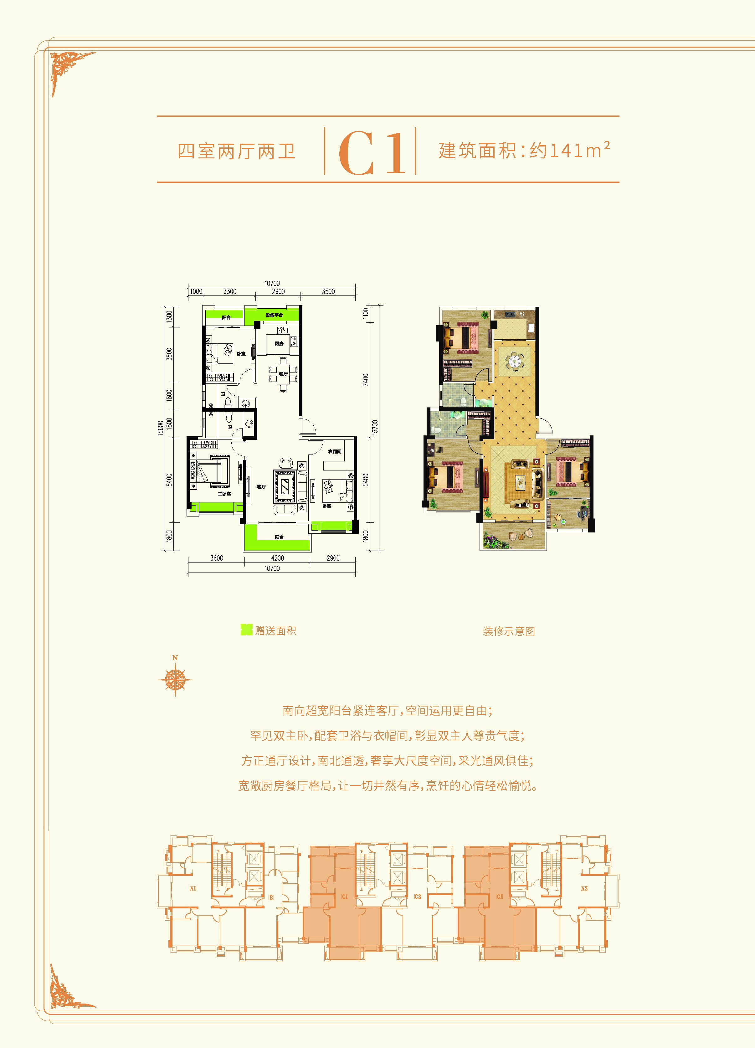 征云公馆位于兴业西路(大真线)旁,5分钟到高山高速口,1小时内达到福州,周边临近海峡交易中心综合商业体; 征云公馆总占地25亩,总建面为6.2万平方,规划为2栋高层和3栋别墅,总用户数达318户(其中包括别墅6户)。其次,推出所有的户型都是南北通透的全明大三房四房户型!两栋高层之间的楼间距达到78米(80米左右),楼栋高度与楼间距之比基本为1:1,最底层都能享受到充足的日照,保证了每户人家的通风与采光,同时也提高了小区园林景观的完整性。