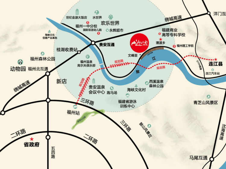 本项目距离福州市区约28公里。本案经贵新隧道通车走福州绕城高速,到达福州市区、连江县城等仅20分钟车程,至长乐国际机场仅40分钟,交通方便快捷,区位条件优越。贵安是距离福州市中心最近的高端度假区,成为在全国已开发的400多处温泉旅游区中距离省会中心城市最近的地方,也是福州区内至宁德、长乐、浙江的主要通道之一。 目前市政府又规划了一条晋安经贵安至连江的旅游快速通道,起点为五四北秀峰路终点,建成后福州至贵安约14.6公里,贵安至连江约18.3公里,预计2016年4月通车。