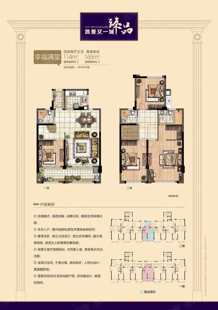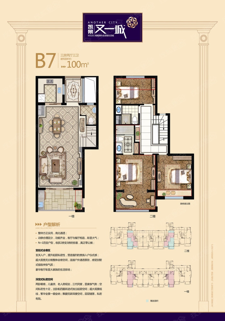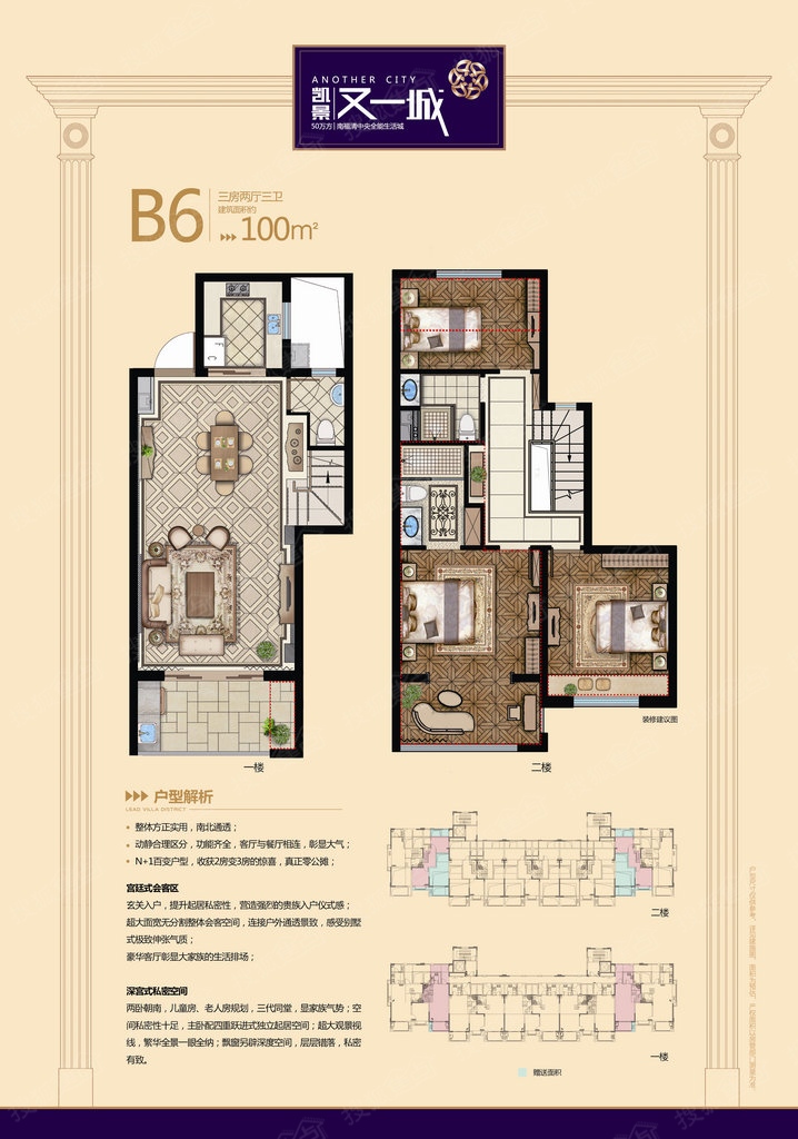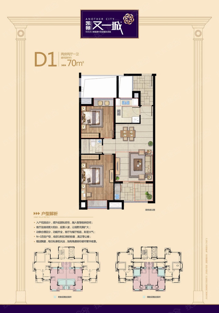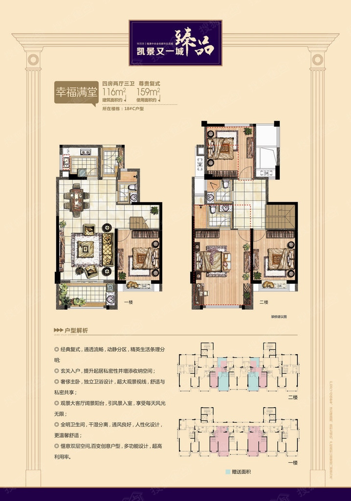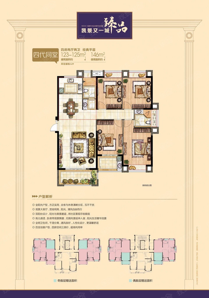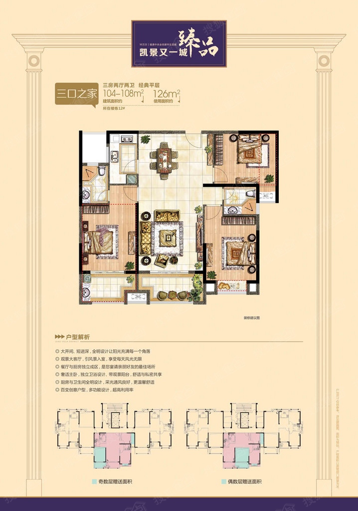 项目在规划设计时,充分考虑业主的居住品质和居住氛围,首创抬高地平的做法,改变常见地下室的规划,不仅优质实现了人车分流,更为社区的景观设计赋予了更多的空间和层次。简约大方的新古典主义建筑风格,全系精工打造,呈现优质天际线和恢宏气势。项目秉承凯景集团一贯精良的设计风格,做到大空间,大景观,大楼距,大商场,户型面积从70-120㎡等多种户型,朝向、采光、通风、视野俱佳,在无限视野中让自然光和清新空气在屋子里自由穿行。