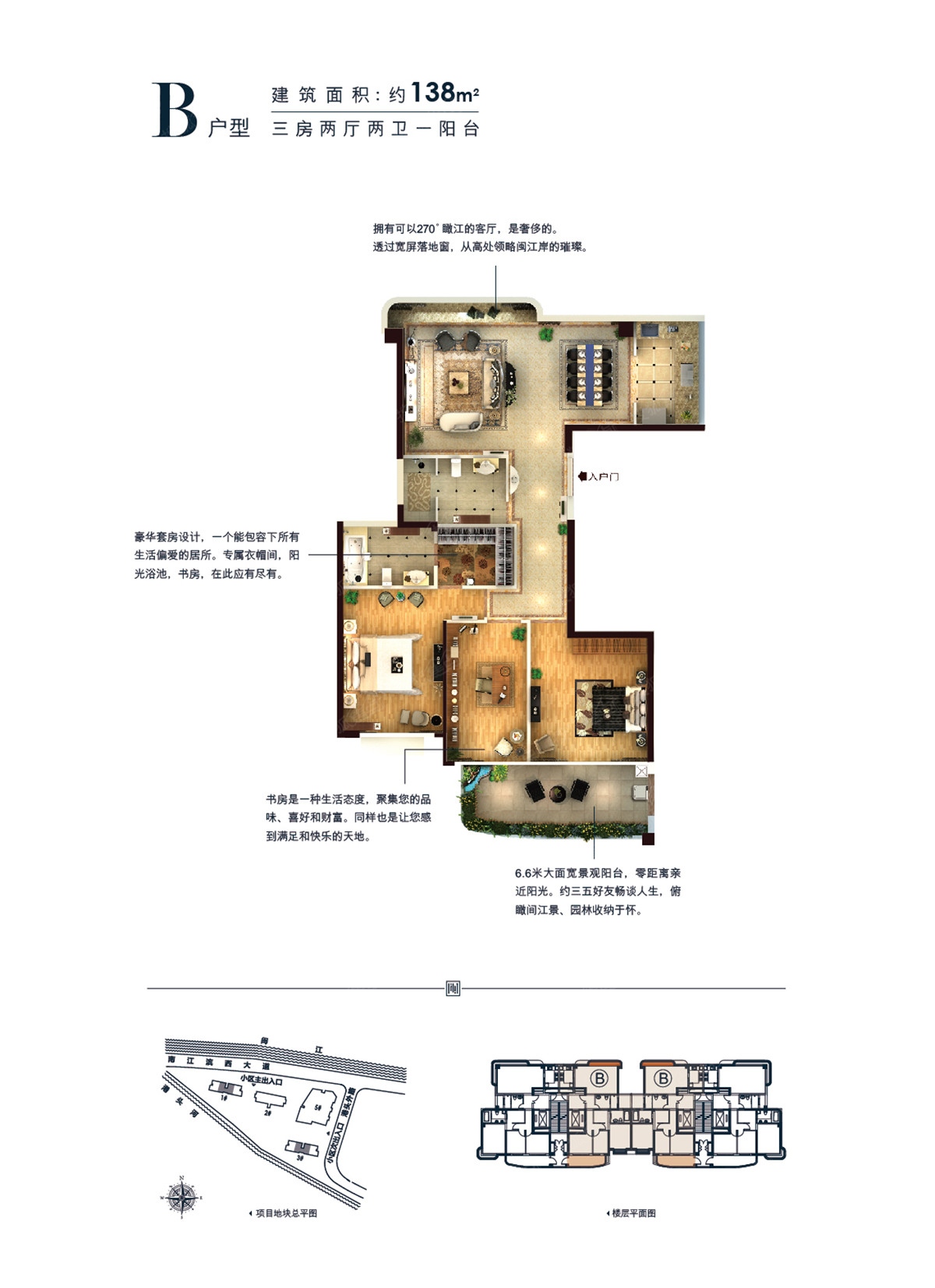 闽樾湾特聘加拿大皇家设计师担纲设计,以精工奢宅造诣,重新定义中国当代奢宅价值标准。3栋纯板式高层豪宅沿江一线摆开,前后无遮挡视野,270度环幕宽屏落地窗,从容收揽滨江水岸繁华盛景;独特的流线形立面,与迪拜塔系出同源的LOW-E玻璃,再造成闽江岸上的时代封面。7.95米挑高入户大堂,彰显贵族气度;5000㎡高端精品商业,汇聚鼎富圈层;高品质物管服务,匹配奢宅生活方式;以138-300㎡现代封面奢宅,敬献时代大人物。