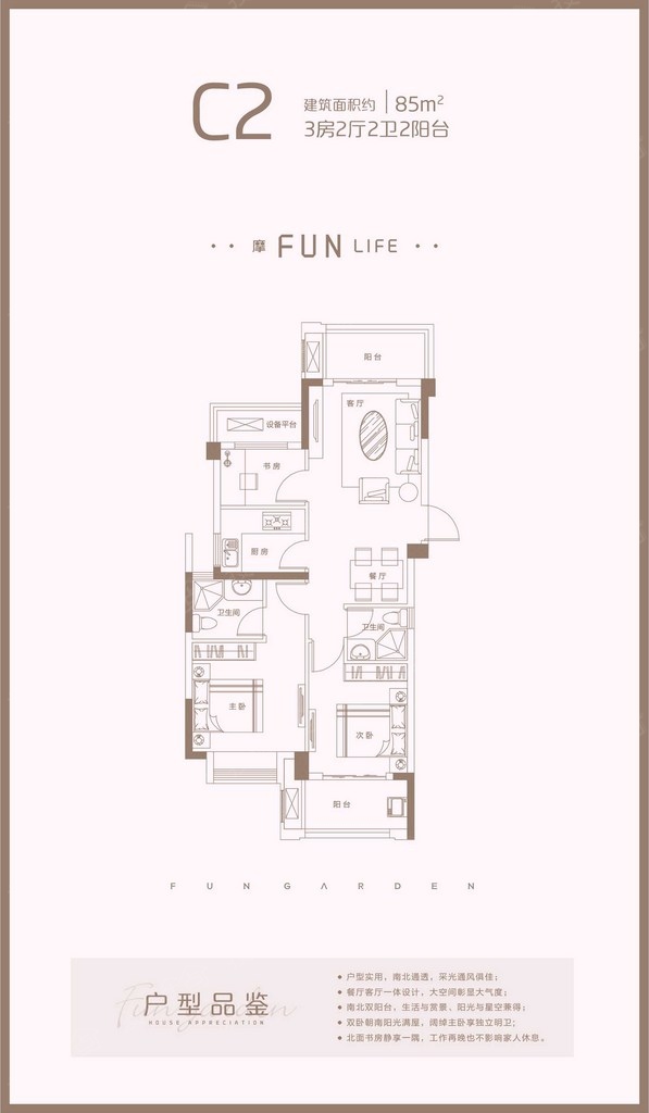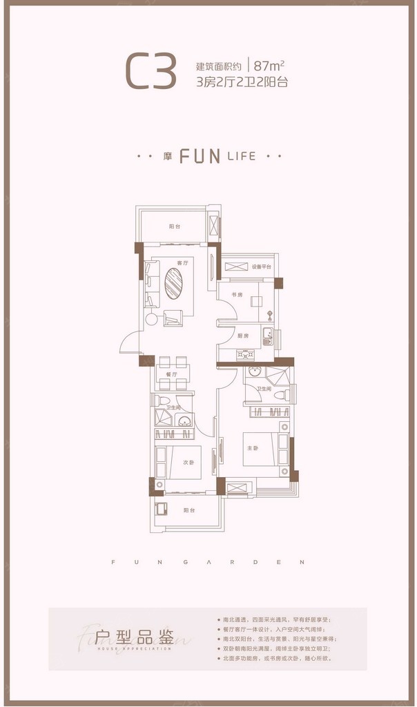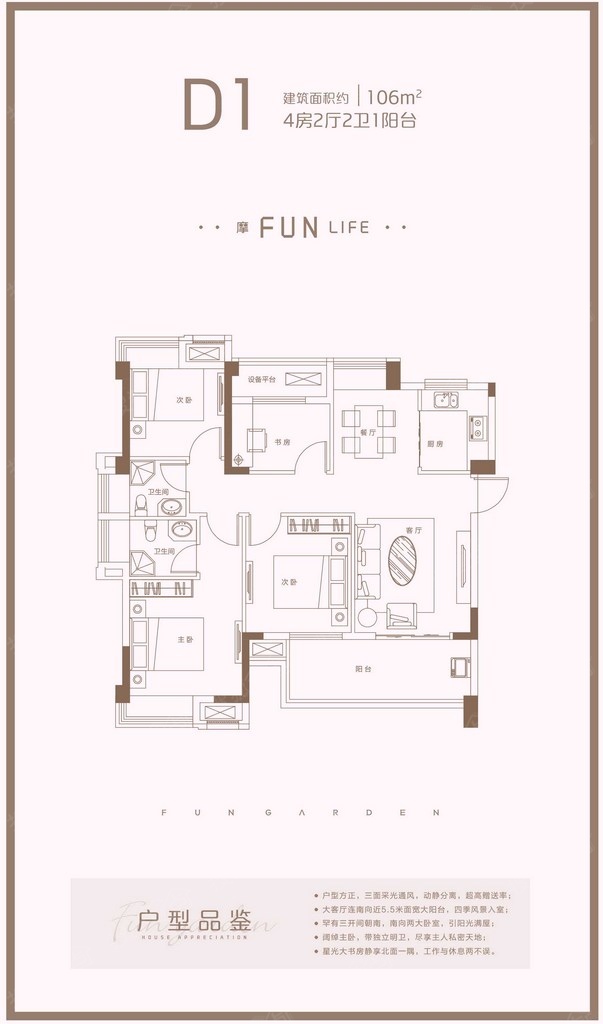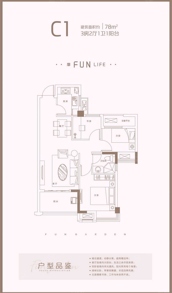 项目规划为新亚洲风格建筑,2栋12-14层低密度洋楼,约36-106㎡洋楼小户,从单身公寓、甜蜜两房、舒居三房到敞阔四房,超高赠送率。福晟奥园以开创性的人居理念,打造集轻奢精致、时尚活力、健康舒居于一体的摩FUN住区,为福州年轻的精英阶层缔造都会理想家。