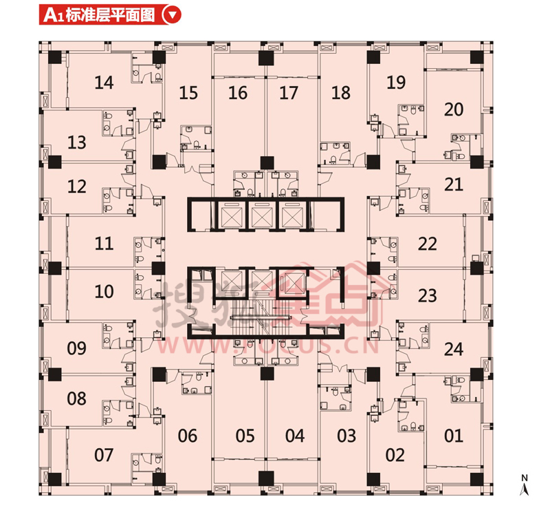 SOHO办公楼共四栋,层高均为3米,其中西侧商业步行街上方两栋一栋28层,一栋29层。标准层面积900平方米。设置有3部客梯,1部消防梯。每层设置公寓20套。位于东侧商业综合体上方两栋均为28层,标准层面积1200平方米。设置有5部客梯,1部消防梯。每层设有公寓24套。