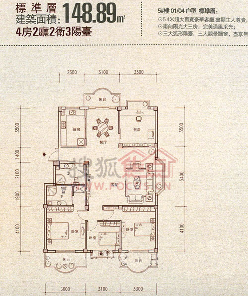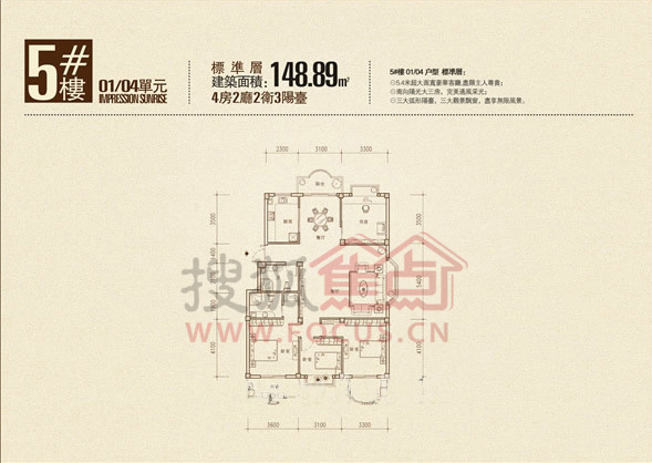 4室2厅2卫-日出印象5#楼01、04单元 4房2厅2卫3阳台 面积:148.89㎡