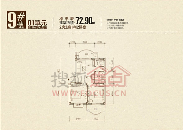 2室2厅1卫-日出印象9#楼 01单元 2房2厅1卫2阳台 面积:72.90㎡