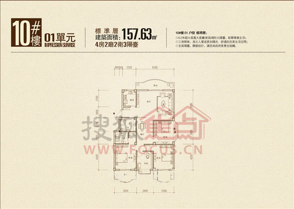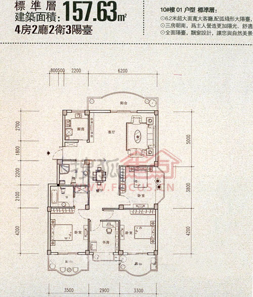 4室2厅2卫-日出印象10#楼01单元 4房2厅2卫3阳台 面积:157.63㎡