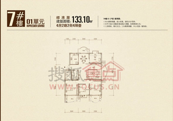 4室2厅2卫-日出印象7#楼 01单元 4房2厅2卫4阳台 面积:133.10㎡