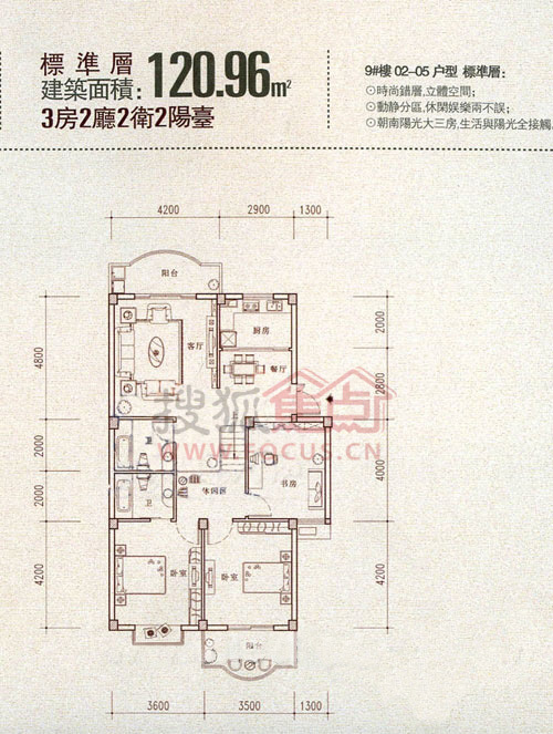 3室2厅2卫-日出印象9#楼 02-05单元 3房2厅2卫2阳台 面积:120.96㎡