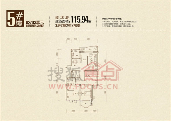 3室2厅2卫-日出印象5#楼 02、03单元 3房2厅2卫2阳台 面积:115.94㎡