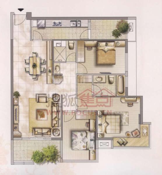 3室2厅1卫-中天金海岸领江十栋 0306户型 3室2厅1卫1厨102㎡
