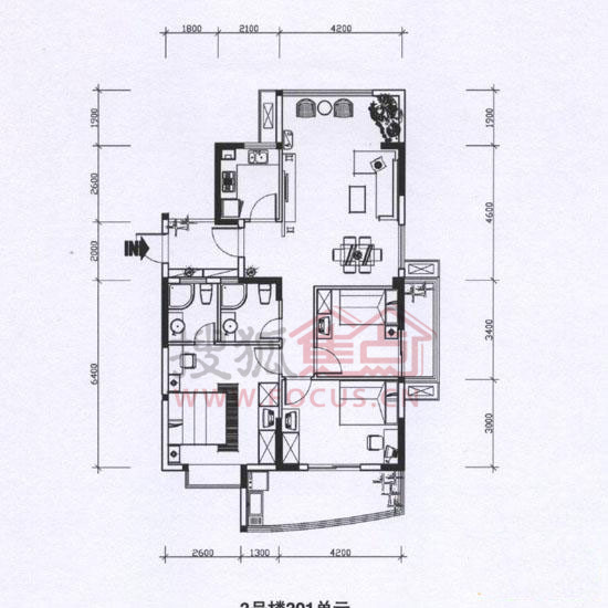 3室2厅2卫-摩卡生活馆 福州 摩卡生活馆 户型图 2#楼301 3室2厅2卫1厨