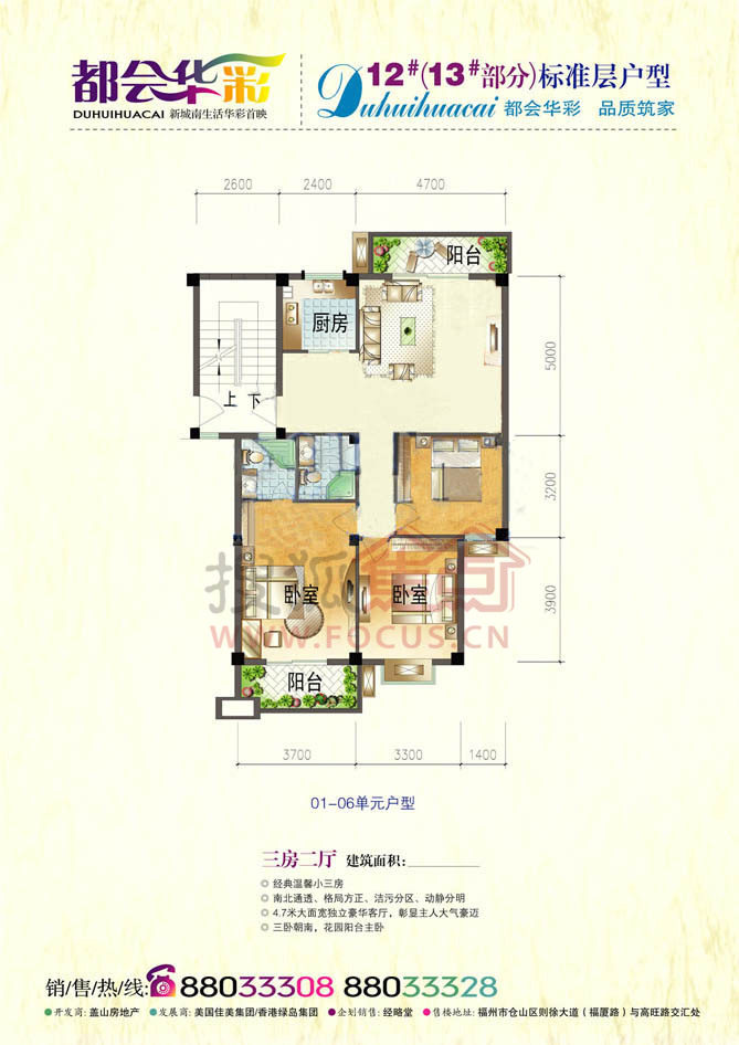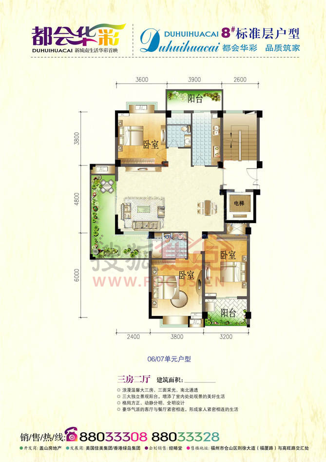 项目介绍:都会华彩位于福州城南仓山盖山投资区后坂,是福州市跨江面海,实施东扩南进,打造城市中央走廊的核心区,地理位置十分优越。项目用地面积约70亩,总共有16幢的商品住宅,总建筑面积80,000多平方米,其中多层的14幢,小高层(11层)2幢,是一个以多层为主,小高层为辅的,低密度、高绿化的住宅小区。目前,这里有3、4、30、803、803(支)、967、970、943、969等将近10路公交线路从此经过。从项目到麦德龙超市仅3公里左右、到汇达永辉超市约6.6公里;到仓实小约3公里,到路对面的省级农村示范校郭宅中心小学仅约0.7公里;到市二医院和鹤龄医院约6.7公里,距盖山镇卫生所、白湖亭医院更是只有千米之遥。再加上,后坂、郭宅、浦下等村庄环绕四周,使得项目业主无论是就医、子女就学,还是日常的出行、购物、娱乐、休闲均十分的便利。景观:植被绿化园林景观:植被绿化