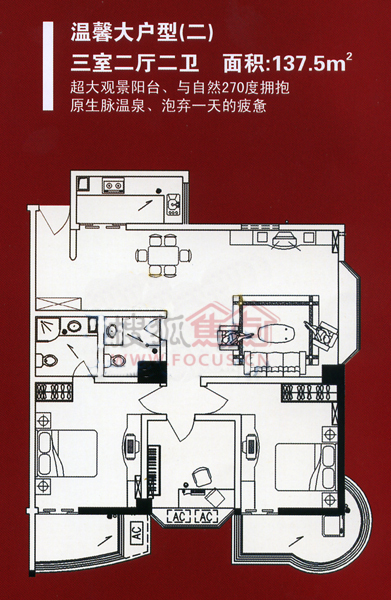 该项目距东街口商业中心不足五分钟车程,而价格却十分超值,32平方的白领公寓总价不到9万,123.65平方的三房两厅总价35万起(并配有温泉入户)。