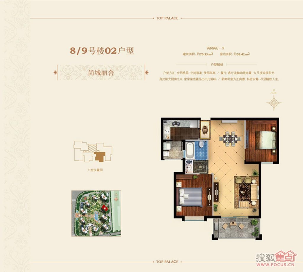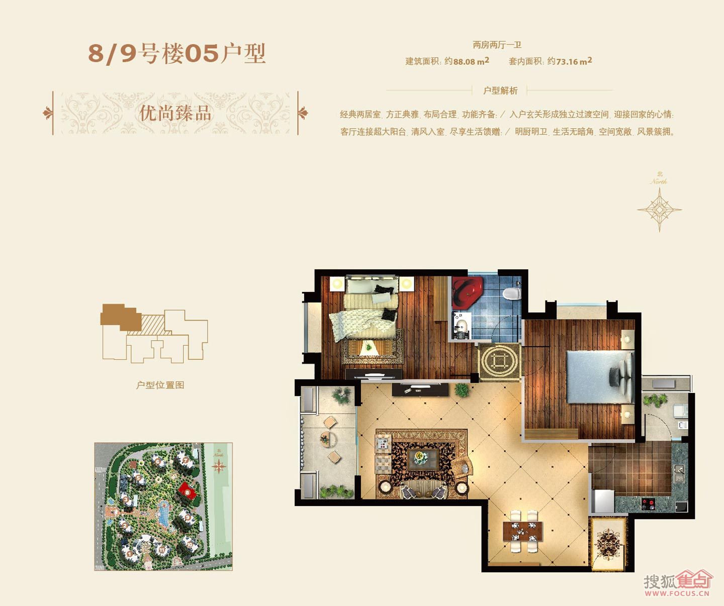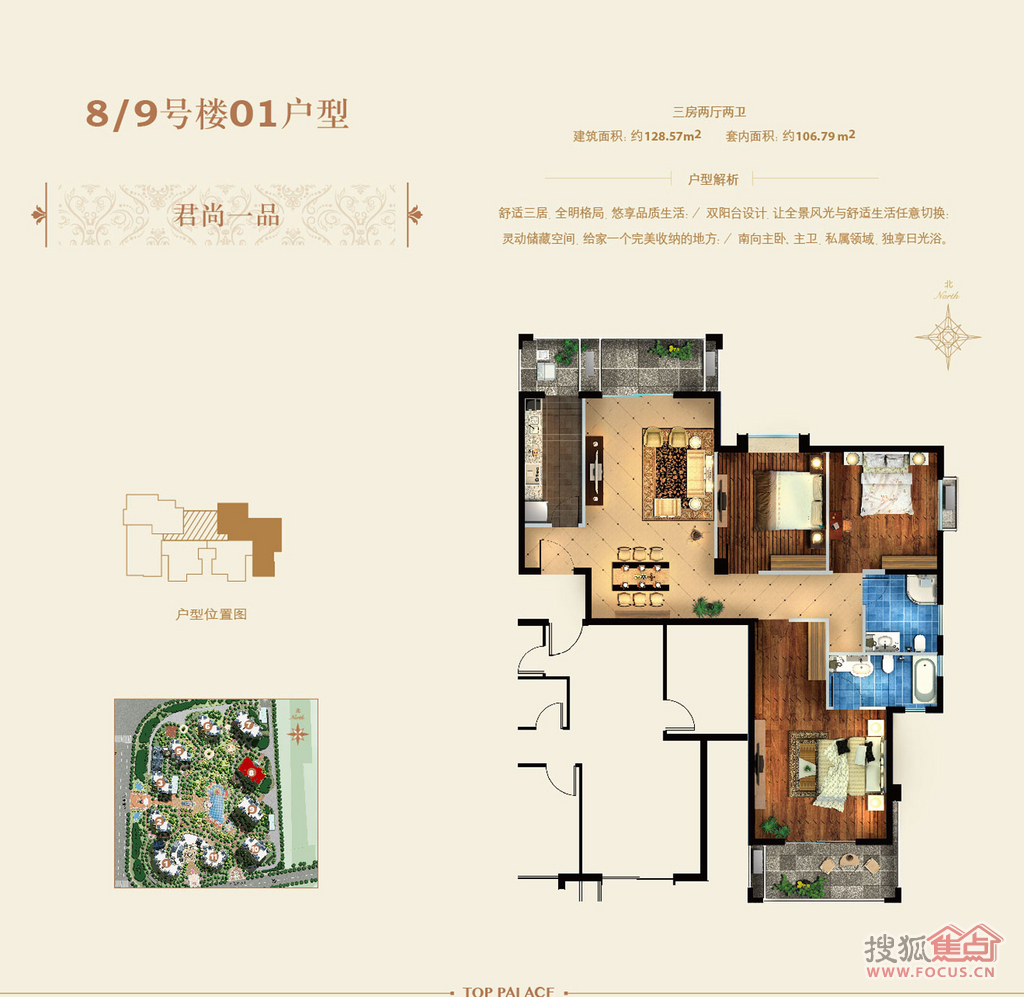 项目采用人车分流设计,中央合围式园林设计,多层立体绿化,拥有露天泳池会所。