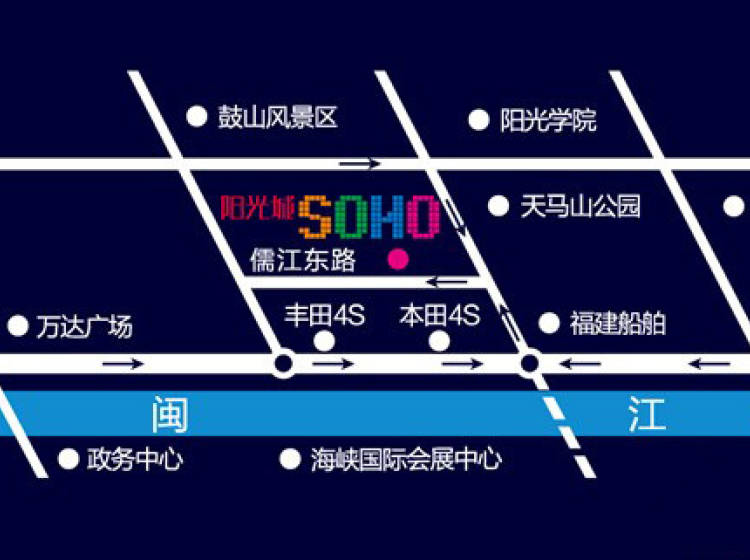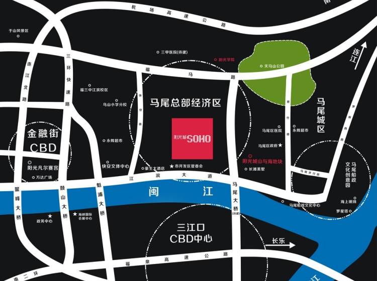 阳光城SOHO位于福州马尾总部经济区。距福州中心城区约13公里,距长乐市区约9公里;距福州金融街商业中心只要数十分钟车程。未来马尾新区将建成兼具自然山水与人文特色的宜居宜业综合新城。