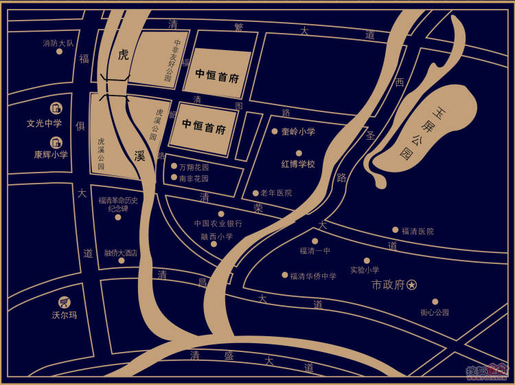 中恒首府毗邻福俱大道,与虎溪一线相邻,虎溪公园、中非友好公园两大公园环绕;随着福俱大道的开通、清图大桥的全线通车,使得中恒首府的交通优势、区域优势全面升级。经清图桥沿福俱大道至融侨酒店、沃尔玛等繁华商圈仅5分钟车程,全方位城市配套自在掌控。低密度、高绿化规划高层、联排等高端物业,ArtDeco皇家建筑风格,展现卓尔不凡的贵族风范;60米超宽楼距,酒店式双入户大堂,超值增送面积,充分保证生活的景观畅享与私密尊崇。