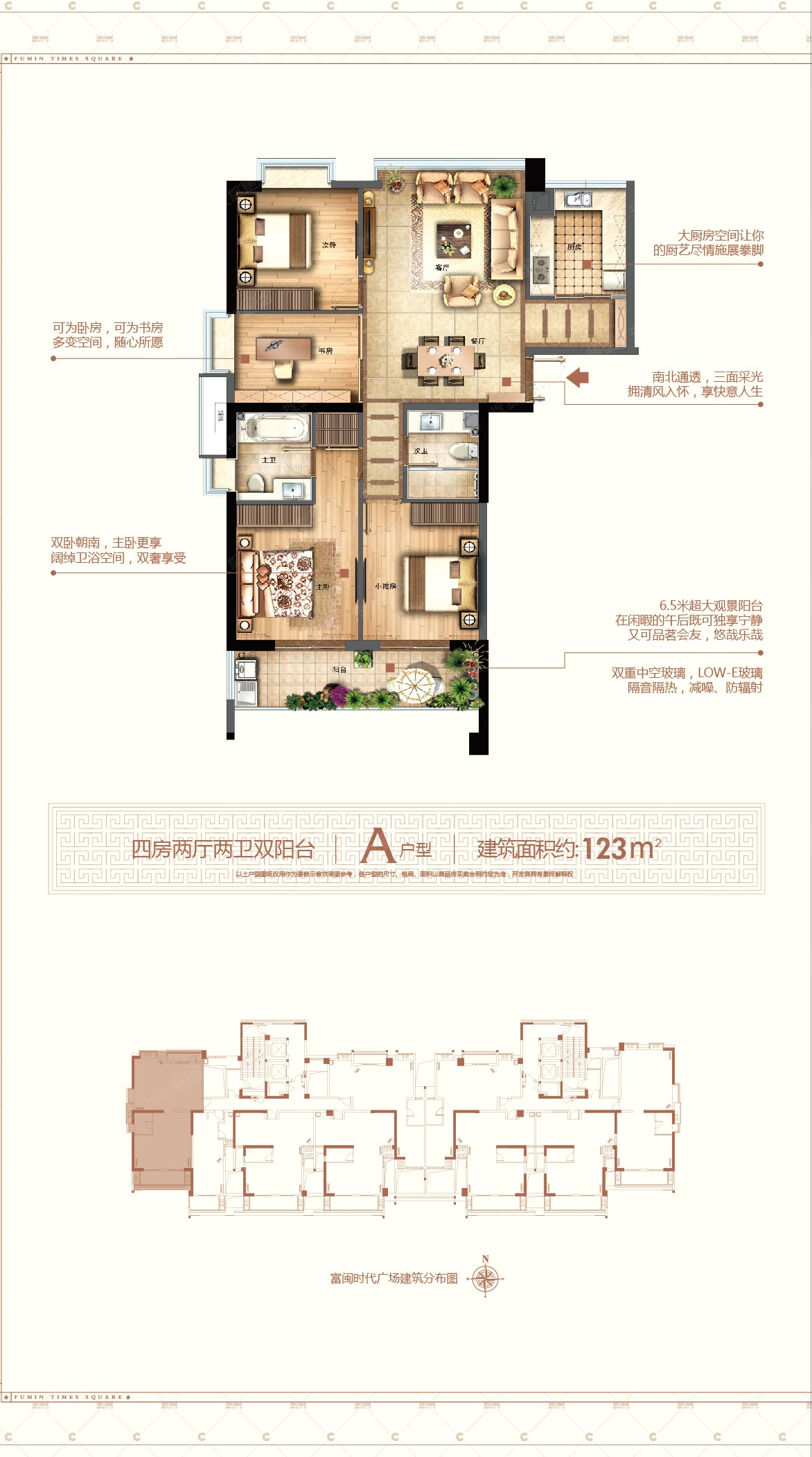 社区配套:4.5米140平入户大堂,提供阅读、会客服务,24小时管家服务、20000多㎡的综合体商业配套。