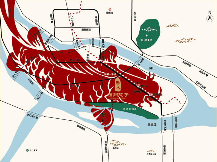泰禾福州院子,扼守着大福州东扩南进的桥头堡,北望五虎山南临乌龙江,属于风水学上“背山靠水”的优质风水福地。项目主要规划四坊十八巷,产品集高层与别墅于一体,收藏区域少有新中式山水园林,是悠居养生大盘。