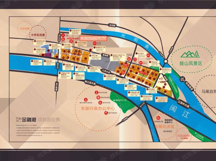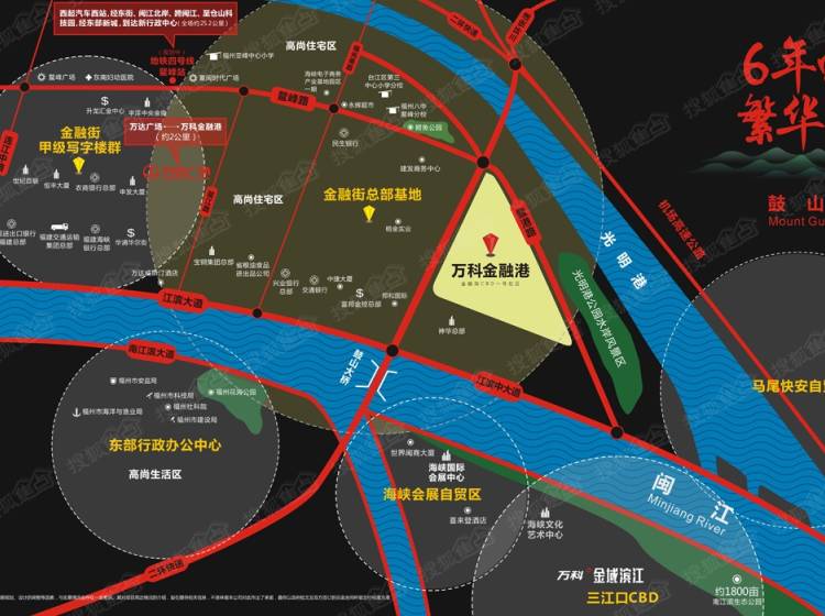 万科金融港项目位于海峡金融街CBD二期·江滨东大道·鳌港路,约两公里半径范围内台江万达广场、威斯汀酒店、永辉超市一应俱全。毗邻闽江、光明港双水系景观资源,一条江滨大道横贯东西,便捷通达全城;往东直达马尾自贸区;两座跨江大桥——鼓山大桥、鳌峰大桥连通南北江滨,往南直达东部行政办公区、海峡国际会展中心,顺福厦高速快速到达福州新区三江口CBD。