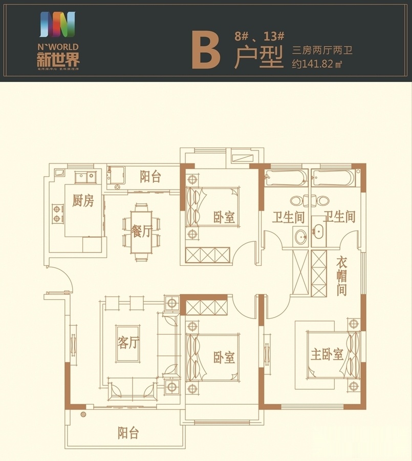 3室2厅2卫-8#13#B户型三房两厅两卫约141.82平