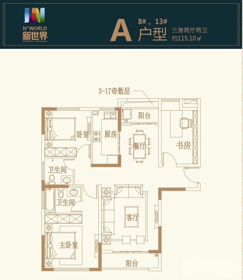 3室2厅2卫-8#13#A户型三房两厅两卫约115.10平