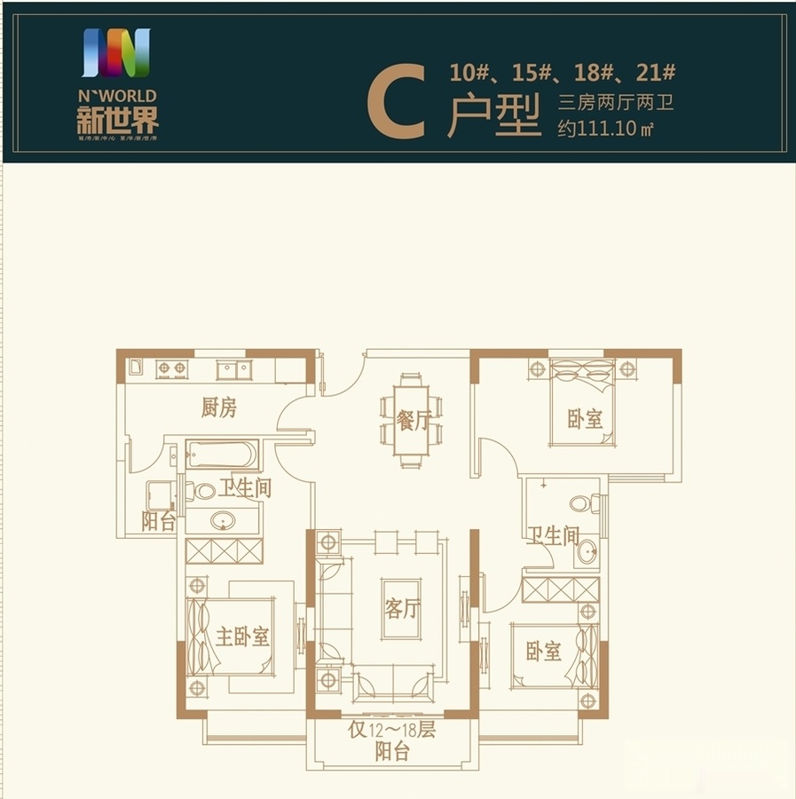 3室2厅2卫-10#15#18#C户型三房两厅两卫约111.10平