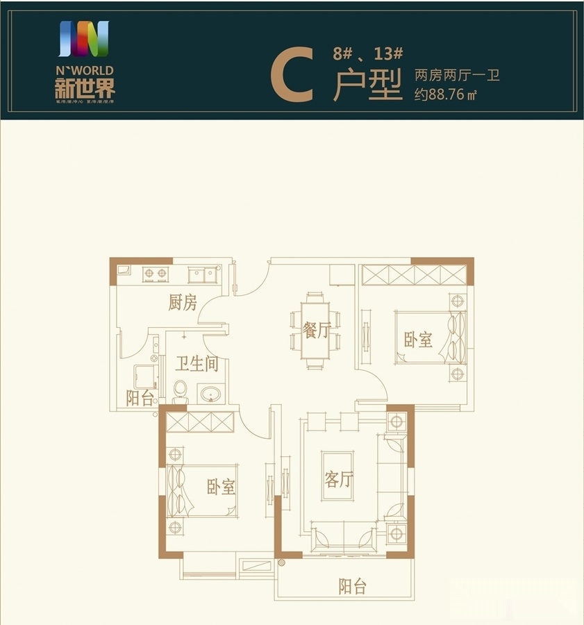 2室2厅1卫-8#13#C户型 两房两厅一卫 约88.76平