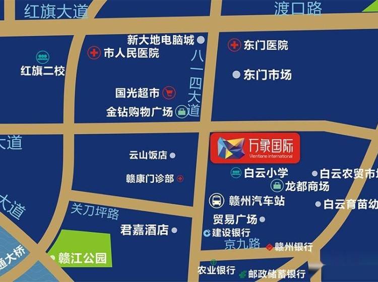商业、医疗:贸易广场、东门市场、龙都商城、金钻购物广场、新大地电脑城、赣州市人民医院、市立医院; 银行:中国银行、建设银行、赣州银行、农业银行、中国邮政; 餐饮、娱乐:华典大酒店、铁龙大酒店、海天大酒店、白云酒店、金赣大酒店。 以住宅、公寓、写字楼、集中式商业、街区商业、购物、文化娱乐、休闲等业态组合而成,定位东城区商务、娱乐、购物、居住中心。