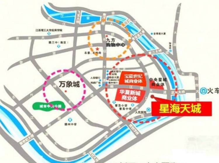 中小学:厚德外国语学校,豪德小学,红旗实验小学,赣州中学,章贡中学 银行:人民银行 医院:新市人民医院 幼稚园:云星中央星城里有 综合商场:春天百货,天虹百货,万盛步行街 休闲娱乐:会议中心,会客中心,商务中心,休闲娱乐中心,健身房 。 游泳池、羽毛球场