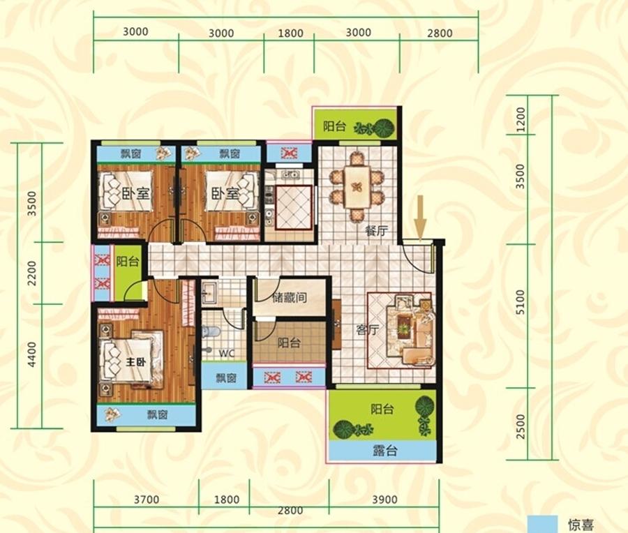3室2厅1卫-A4户型三房二厅约113.69平米